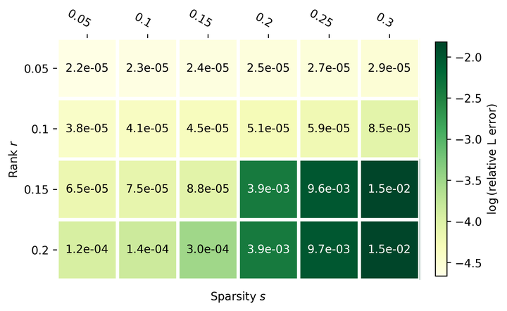 Relative recover error of different problem scales.Principal component analysis (PCA) has been widely used for dimension reduction in data science. It extracts the top k significant components of a given matrix by computing the best low-rank approximation. However, it is well known that PCA is sensitive to noises and adversarial attacks. Robust PCA (RPCA) aims at mitigating this drawback by separating the noise out explicitly. Specifically, RPCA assumes that the observed matrix $M$ can be decomposed as $M = L^* + S^*$ where $L^*$ is a low-rank matrix and $S^*$ is a sparse matrix.